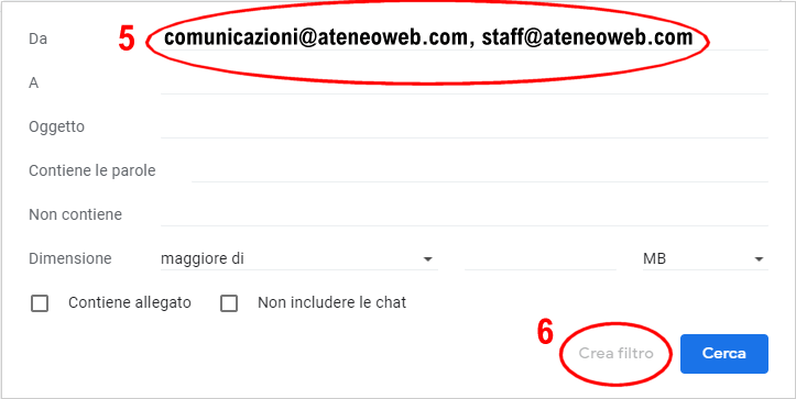 Nel campo "From" digita gli indirizzi email comunicazioni@ateneoweb.com, staff@ateneoweb.com