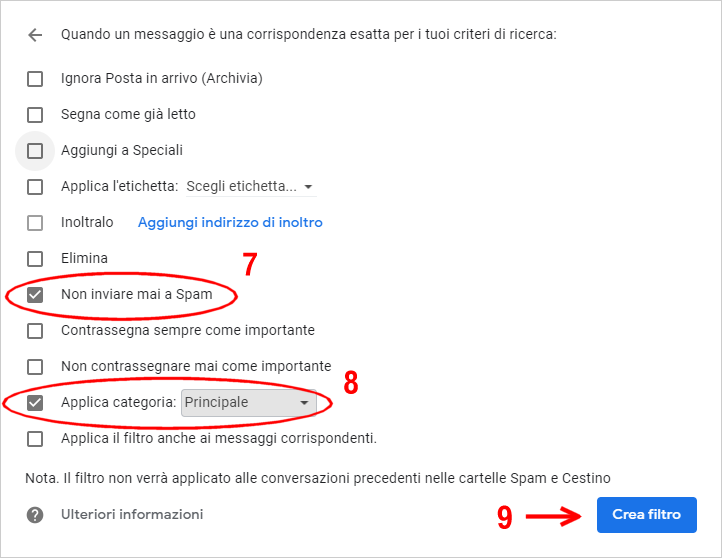 Seleziona le opzioni "Non inviare mai a Spam" e "Applica categoria: Principale" e concludi cliccando su "Crea filtro"